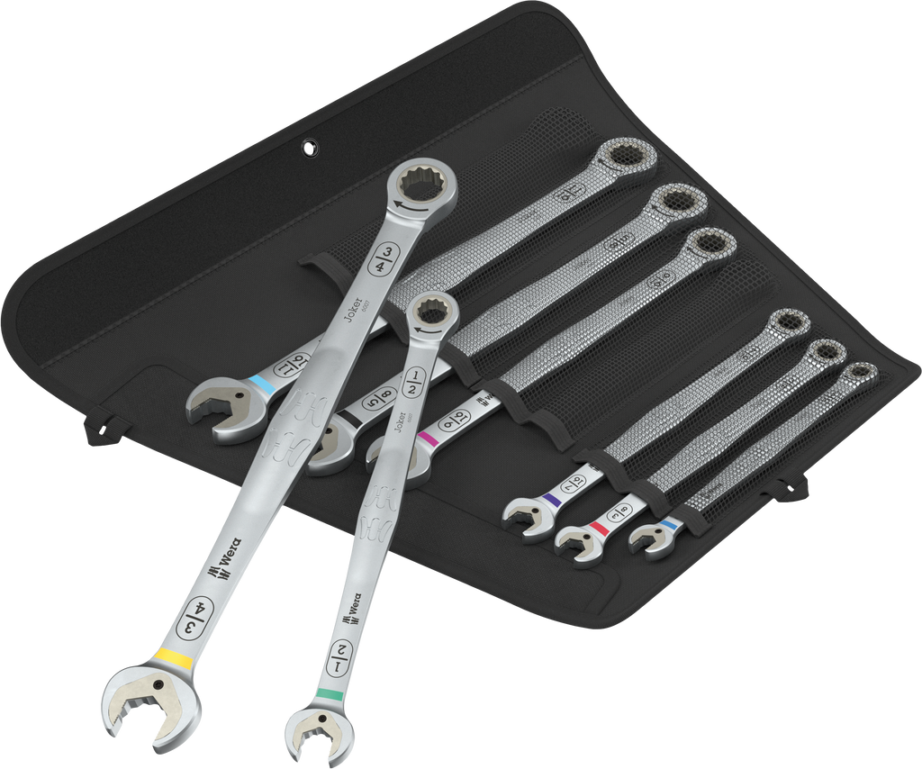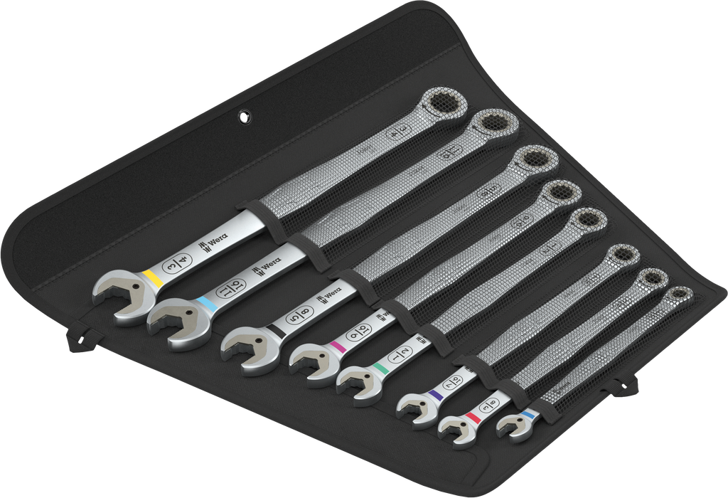 8-piece ratcheting combination spanner set. Imperial sizes. Brilliant combination of jaw end and ratchet mechanism at the ring end in a long design. For hexagon screw heads and bolts. The long lever allows for higher power transmission. The long design also improves accessibility at low-lying couplings. With holding function enabled by a metal plate in the mouth, which reduces the risk of losing screws and sockets. With its extra hard teeth, the exchangeable metal plate in the mouth secures screws and sockets and reduces the risk of slipping. The integrated end stop can prevent the screw head from slipping down and allows application of high torque transfer. The double hexagon geometry ensures a positive connection with the screw or bolt and thus reduces the risk of slipping. A return angle of only 30° at the jaw end avoids time-consuming rotating of the tool whilst screwdriving. Ratchet mechanism at the ring side with exceptionally high fine toothing of 80 teeth for flexibility even in confined spaces. The specially engineered geometry allows high torque transmission and high bending stiffness. Made of high-performance chromium molybdenum steel with nickel-chromium coating for high corrosion protection. With Take it easy tool finder: colour coding by size and extra laser-engraved size indication. In a robust roll pouch for easy transport and clean storage. 2 loops to hang up the roll pouch when closed or open.