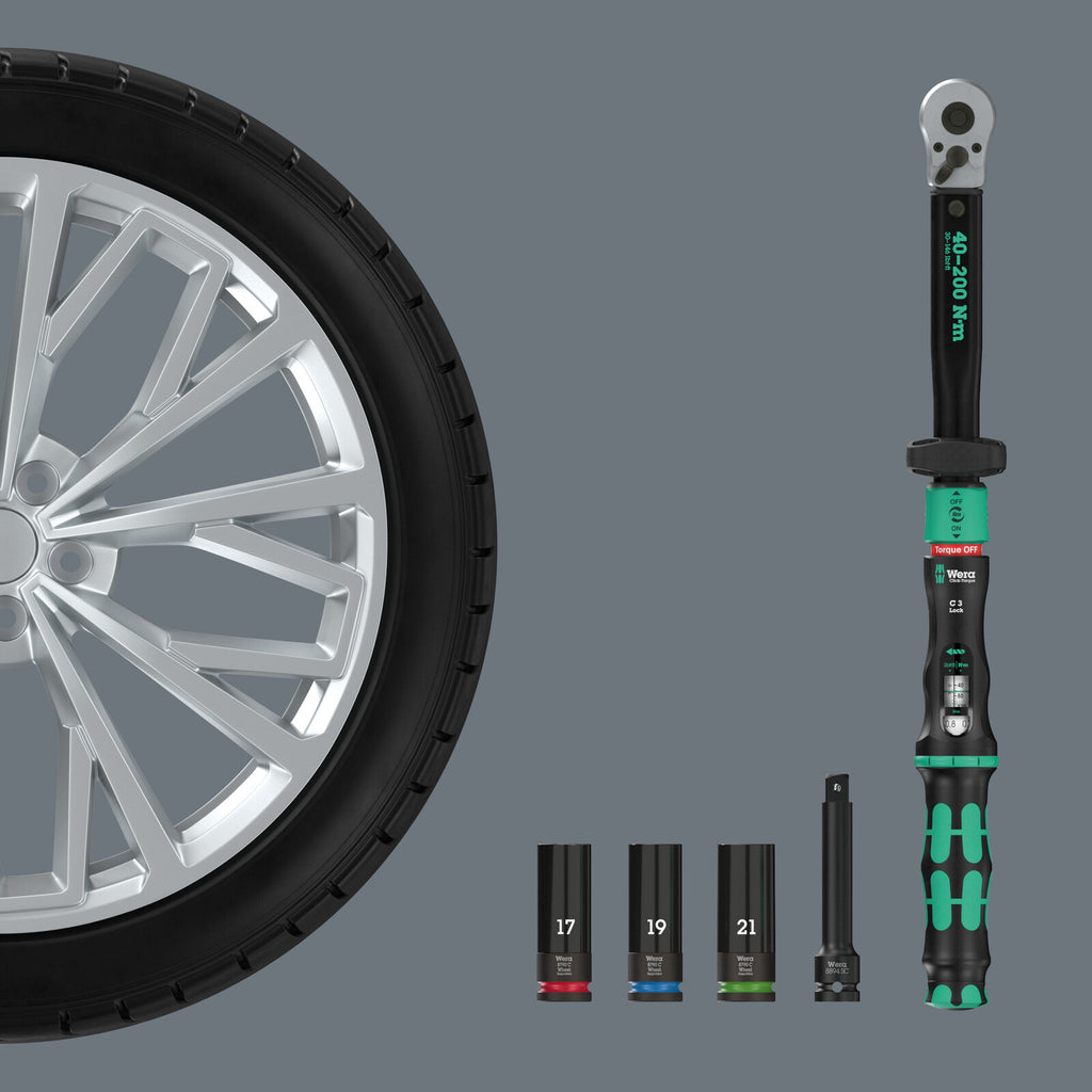 Tool set for the car wheel changeCar wheel change set with Click-Torque Lock: controlled tightening and loosening with only one toolAssembly and disassembly with one torque wrenchOne Click-Torque Lock C 3 torque wrench , 1/2", adjustable, reversible ratchet, Torque Lock functionTorque Lock function: The torque function can be deactivated so that the tool can also be used for loosening screws and boltsProduct Description