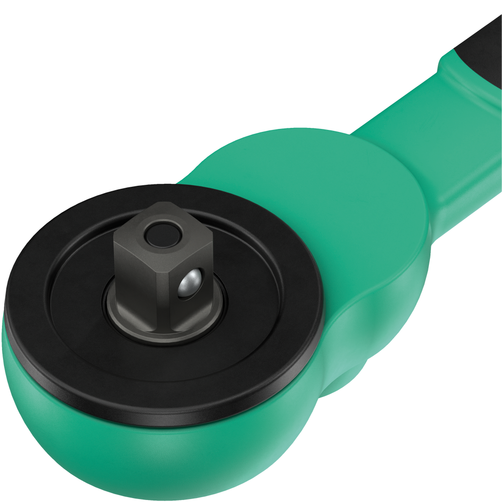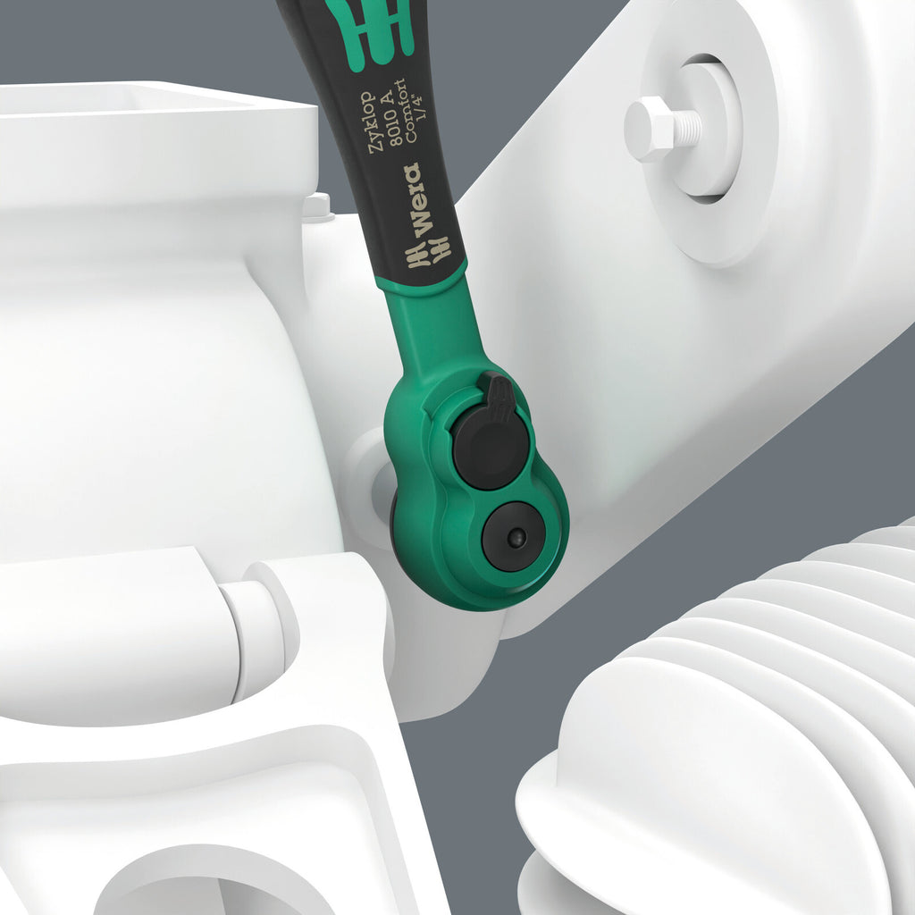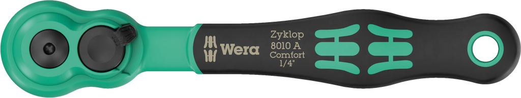 Compelling Wera style Zyklop Comfort ratchet with reversing lever, 1/4". Comfortable 2-component plastic sleeve. Protects sensitive surfaces. Slim design for working even in very confined spaces. The fine toothing with 80 teeth allows for a low return angle of only 4.5°. With reversing lever to reverse rotation easily. With safe socket locking via push-button.