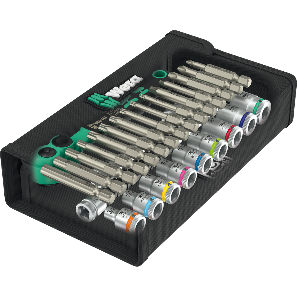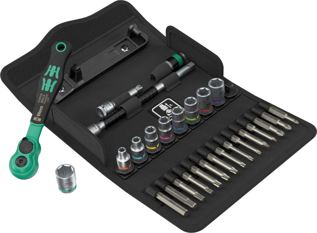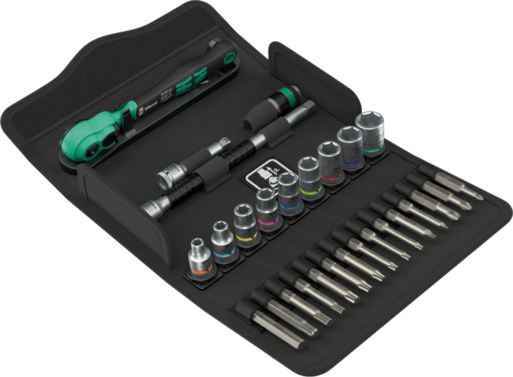 28-piece ratchet set , 1/4", sockets in imperial sizes. One Zyklop Comfort ratchet with reversing lever, fine-toothed with 80 teeth, low return angle of only 4.5°; 9 Zyklop sockets (imperial sizes) with Take it easy tool finder: colour coding by size and extra laser-engraved size indication to find the required tool quickly; one Zyklop extension (150 mm long) with fast-rotating sleeve for fast "spinning", one Wobble extension with pivoting angle of 15° in all directions, one bit adapter (1/4" square head socket to 1/4" hexagonal socket), 15 bits, tough for universal use. One robust textile box, compact design for space-saving tool storage; the firm and light material of the textile box lowers the weight of the set - ideal for mobile use.
